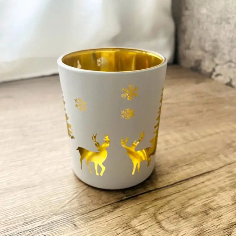 Each glass cup features a gold interior that enhances the glow of a tealight, creating a soft, festive light ideal for winter evenings, Christmas decorating and cozy Nordic-inspired spaces.