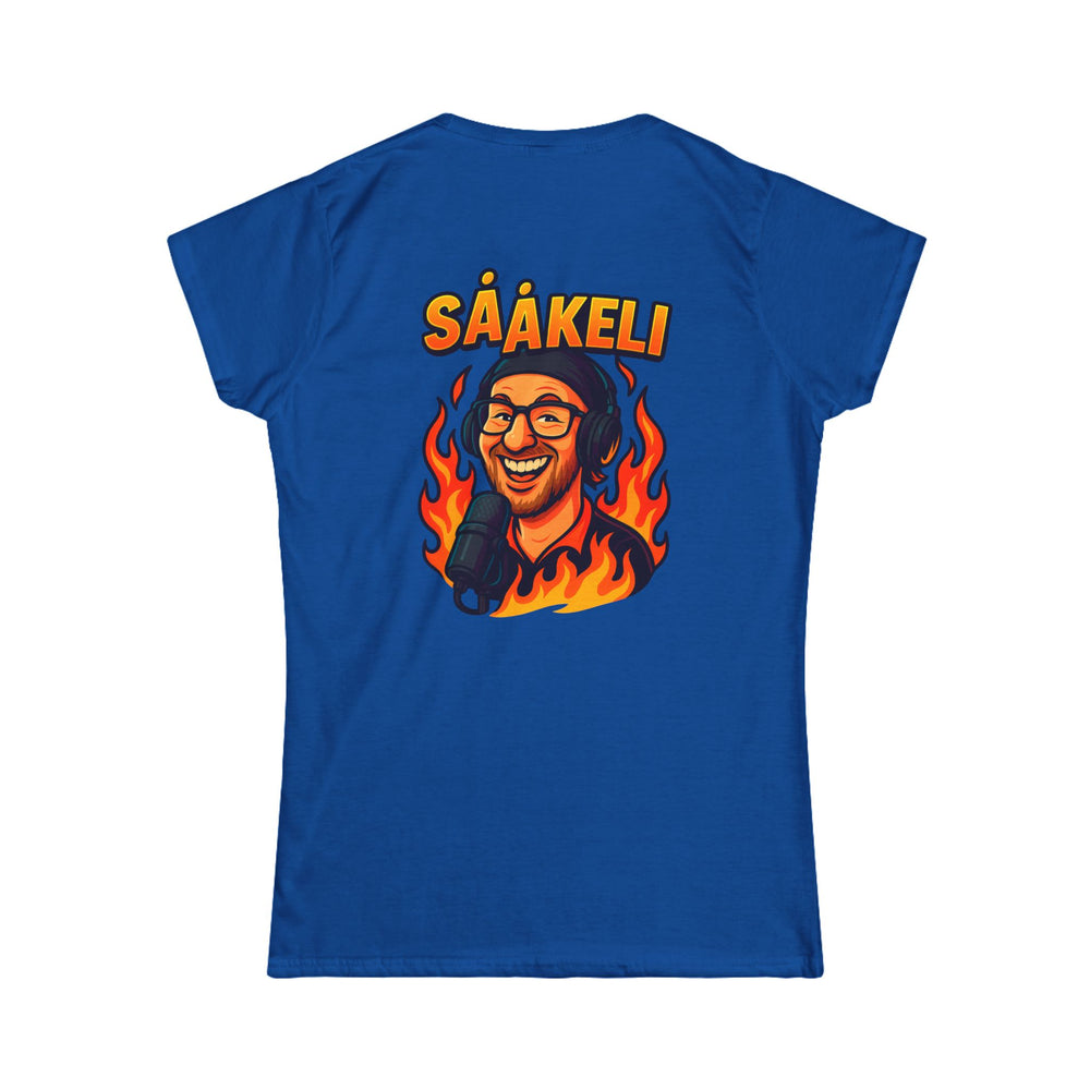 The front features a bold flame-accented “ON AIR” logo, while the back showcases a fiery illustrated portrait and the name SÅÅKELI — confident, playful, and unmistakable. Designed to follow the body naturally without feeling tight, this Ladyfit cut is easy to layer and comfortable under studio lights.