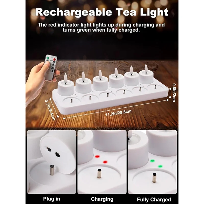 With a convenient remote control, you can adjust brightness, choose between flickering or steady light modes, and set automatic timers for 2, 4, 6, or 8 hours. A full charge takes approximately two hours and provides over 100 hours of continuous illumination, making these tea lights both practical and long-lasting.